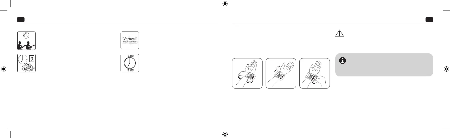• 現在將腕帶拉到手腕上。血壓計位於手腕內側中央約