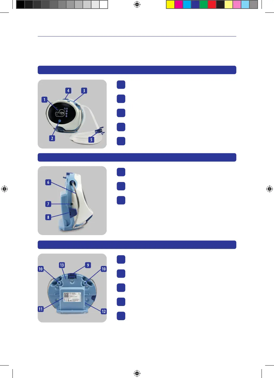Accessible parts of the device: Power supply, front cover, back cover, exudate canister unlock key, On/Off switch, USB cover, base plate and hanger bar, DC connector,