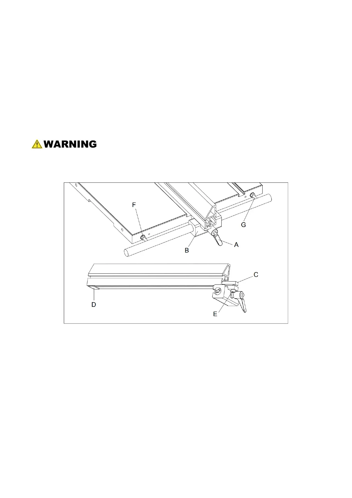 1. Loosen the fence plate locking screws (E) on the left side of the fence guide (B), until the