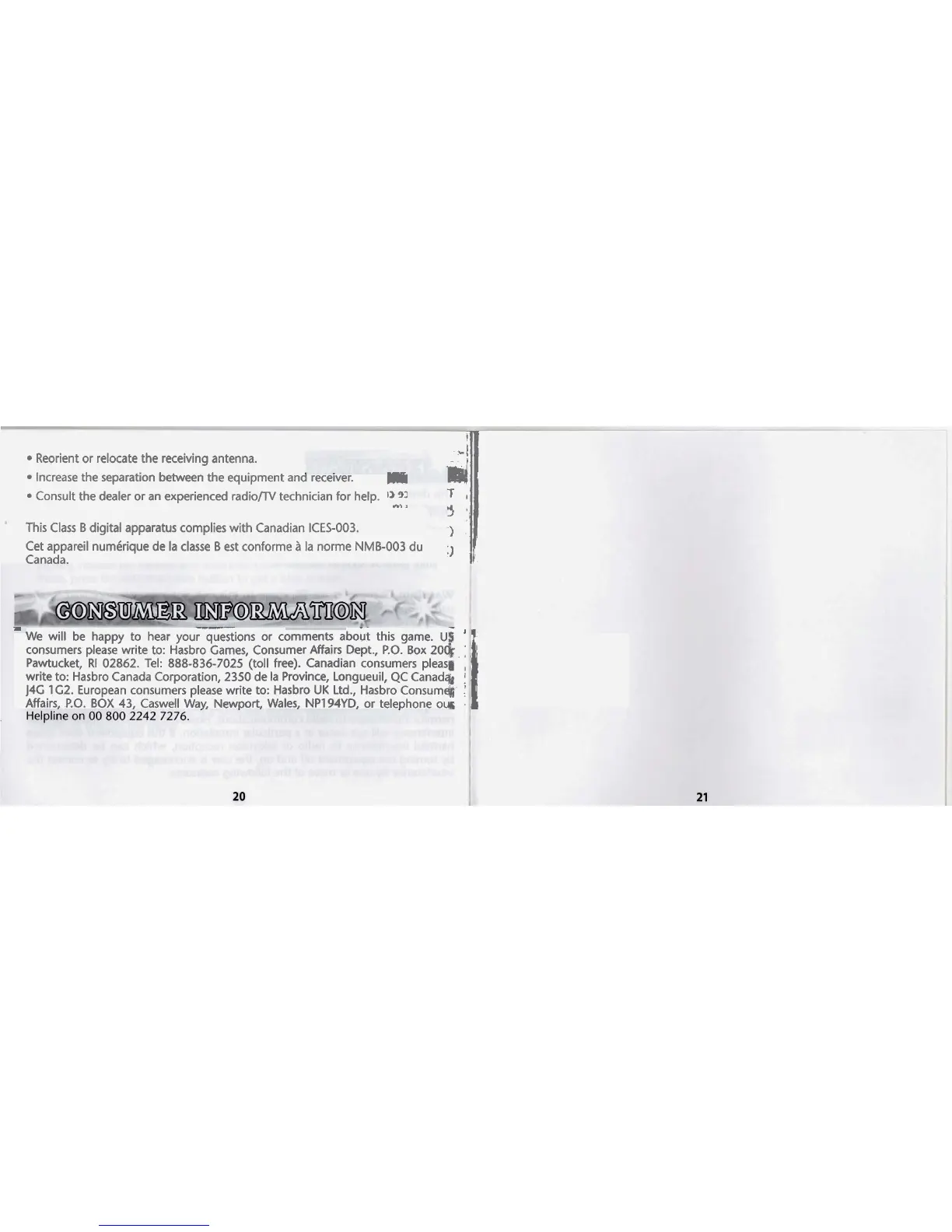 consumers please write to: Hasbro Games, Consumer Affairs Dept., P.O. Box 20C$