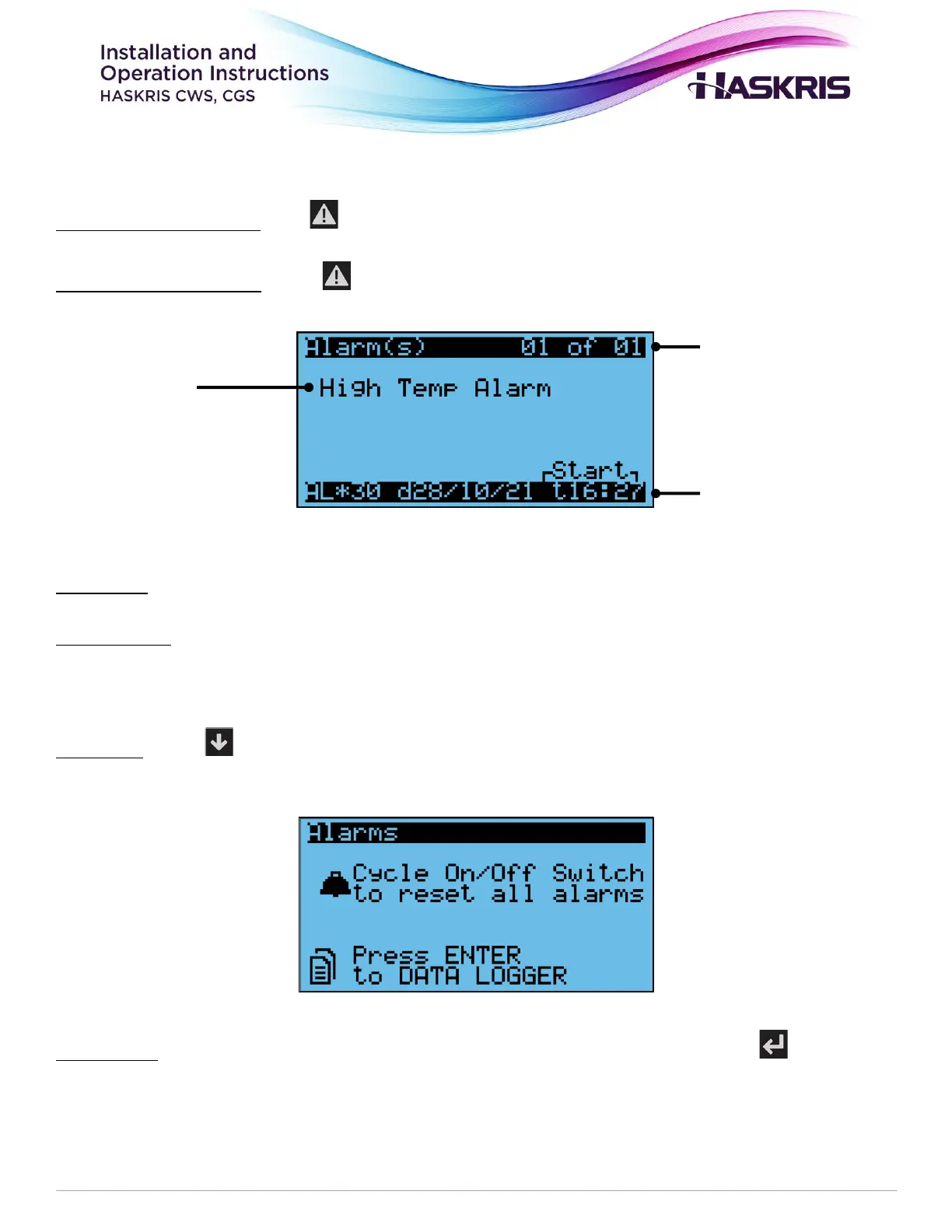 Fault history: When the screen says NO ALARMS, there are no faults currently. Press to see the
