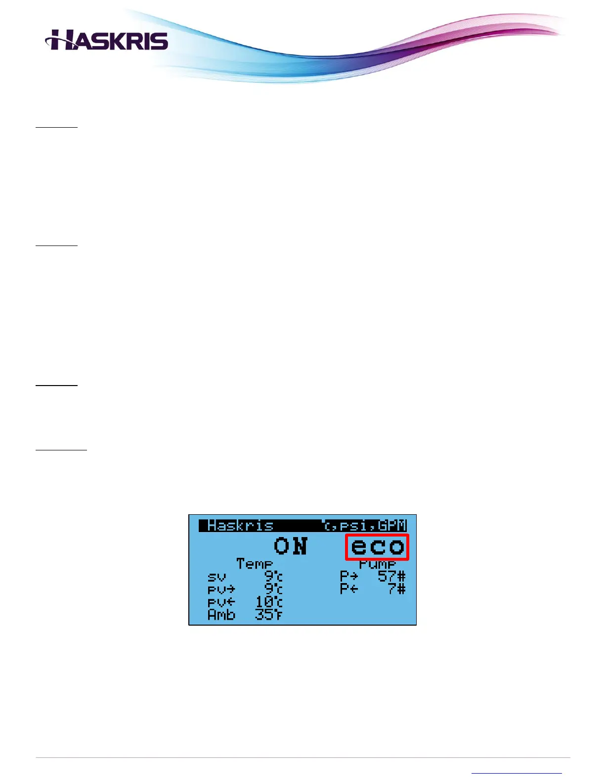 Operation: When the chiller is in eco mode, the status on the display will say “ON eco”. The controller