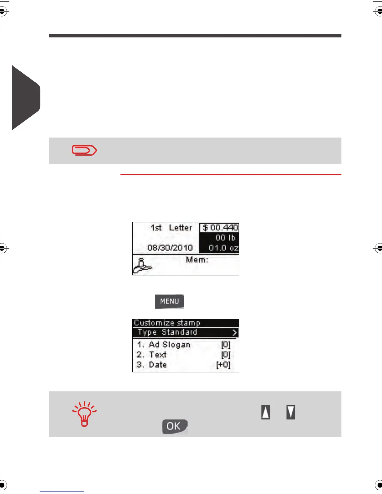 type of imprint . The home screen indicates weight, postage