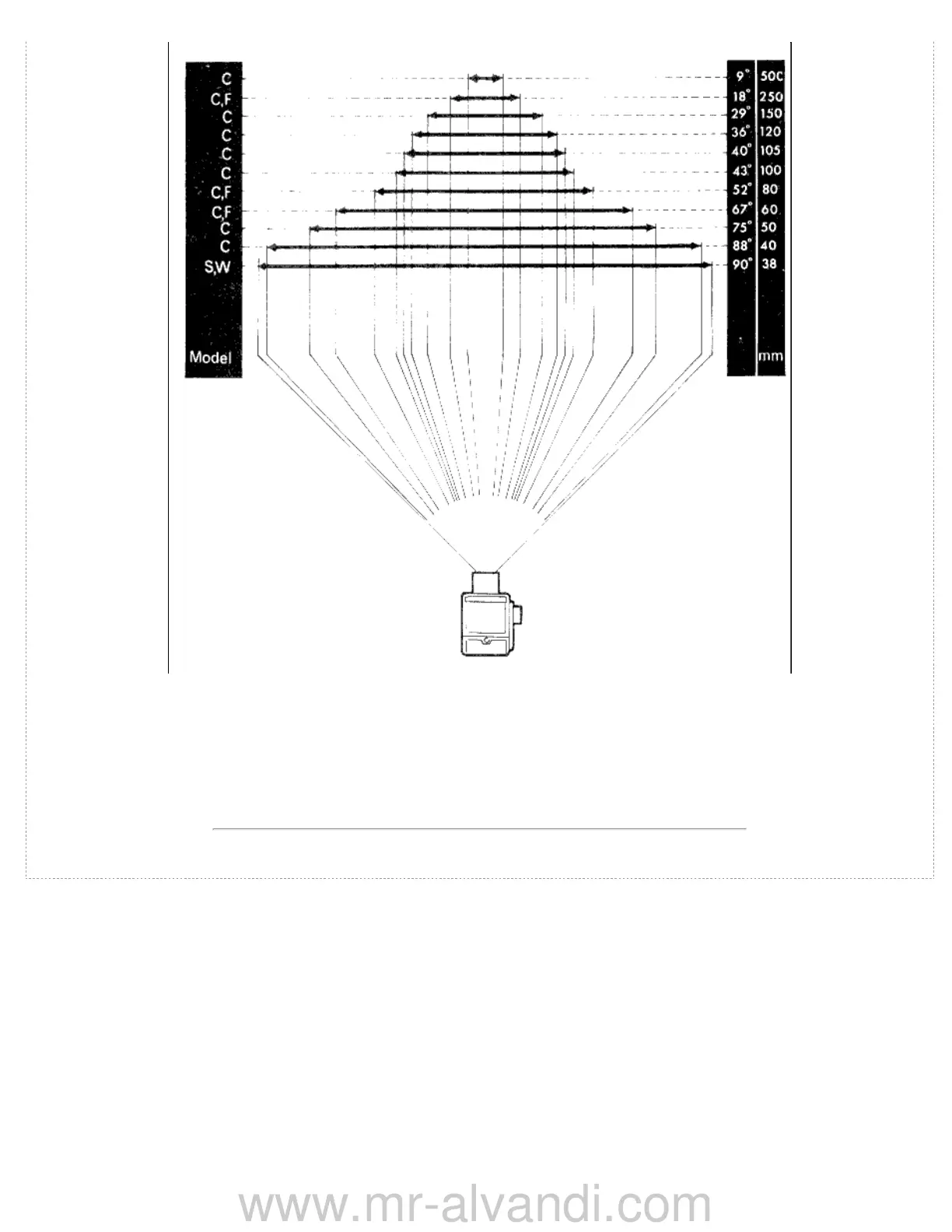 This diagram indicates the main lenses available for the Hasselblad camera, with their focal lenghts and angles of view. The letters