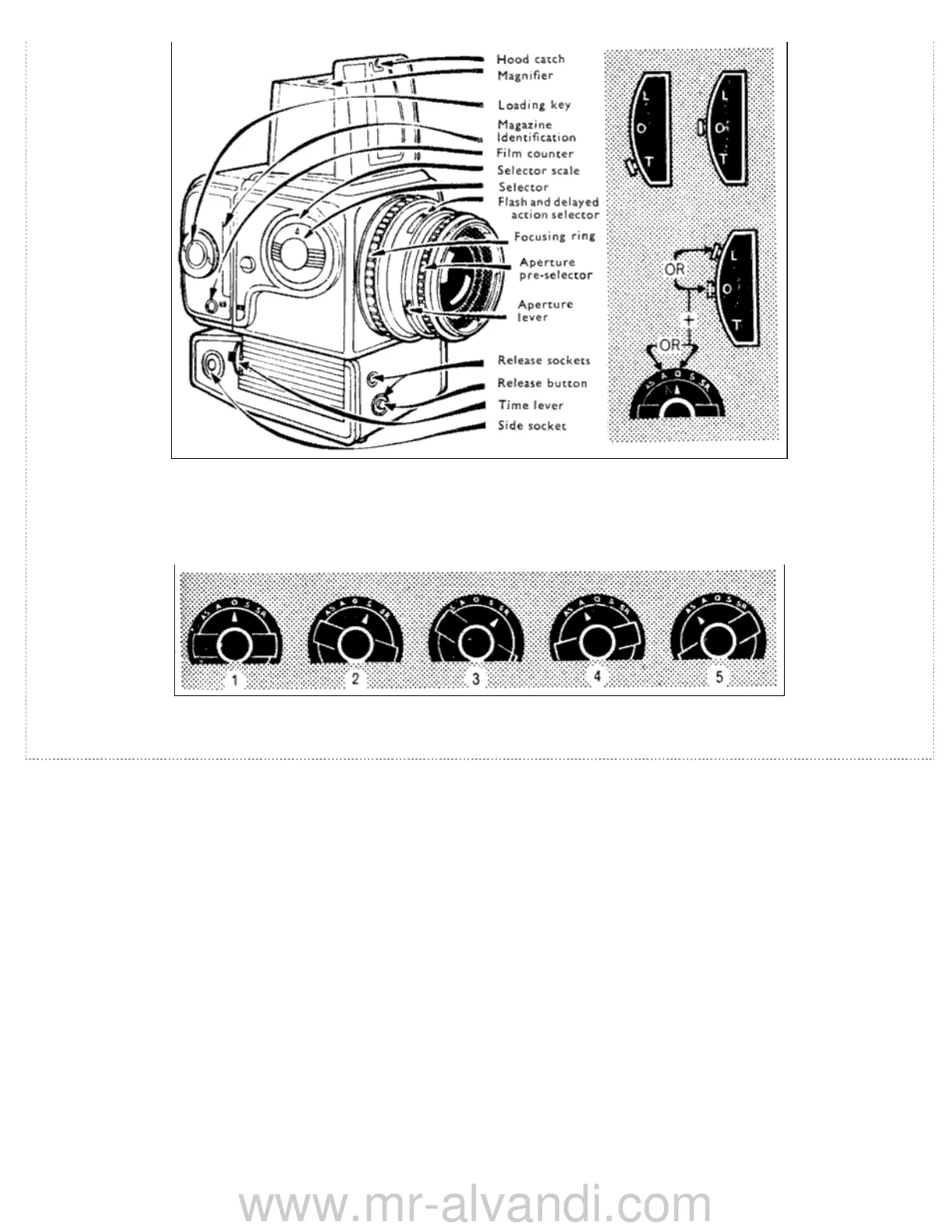 The selector scale on the 500EL The figures used here correspond to those on page 7 of this section: 1. Normal setting. 2. Speed