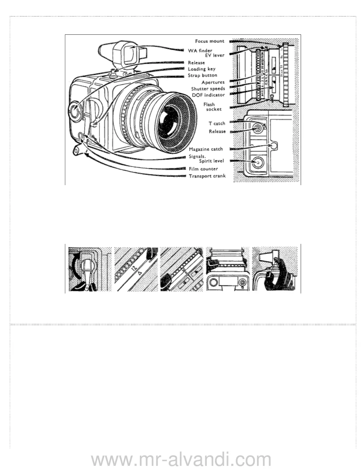 exposures. The loading key on the magazine advances the film for the first exposure. The strap button takes the carrying strap.