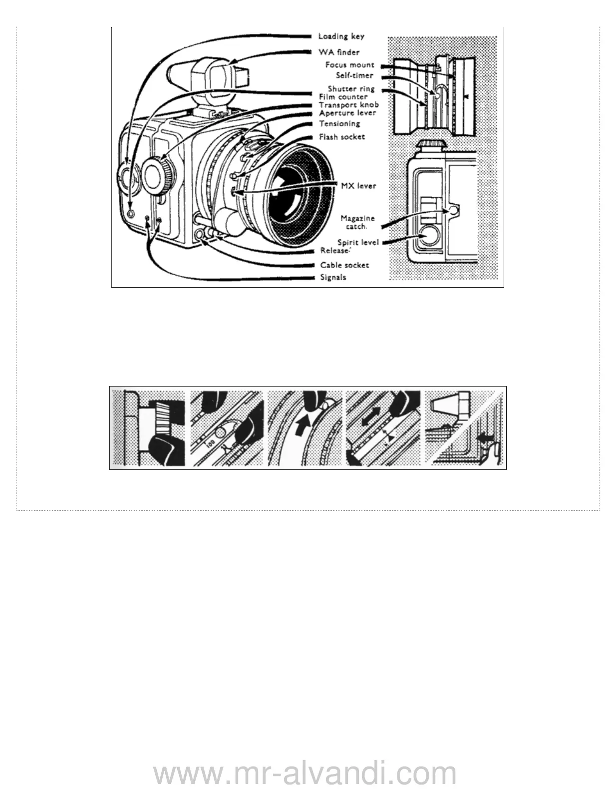 The loading key advances the film to the first exposure, after which the film counter in the side of the magazine indicates the