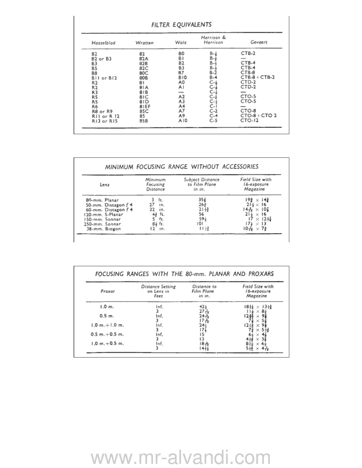 Hasselblad 500 C - FILTER EQUIVALENTS; Minimum Focus Range without Accessories; Focusing Ranges with the 80-mm. Planar and Proxars; Focusing Ranges with Extension Tubes