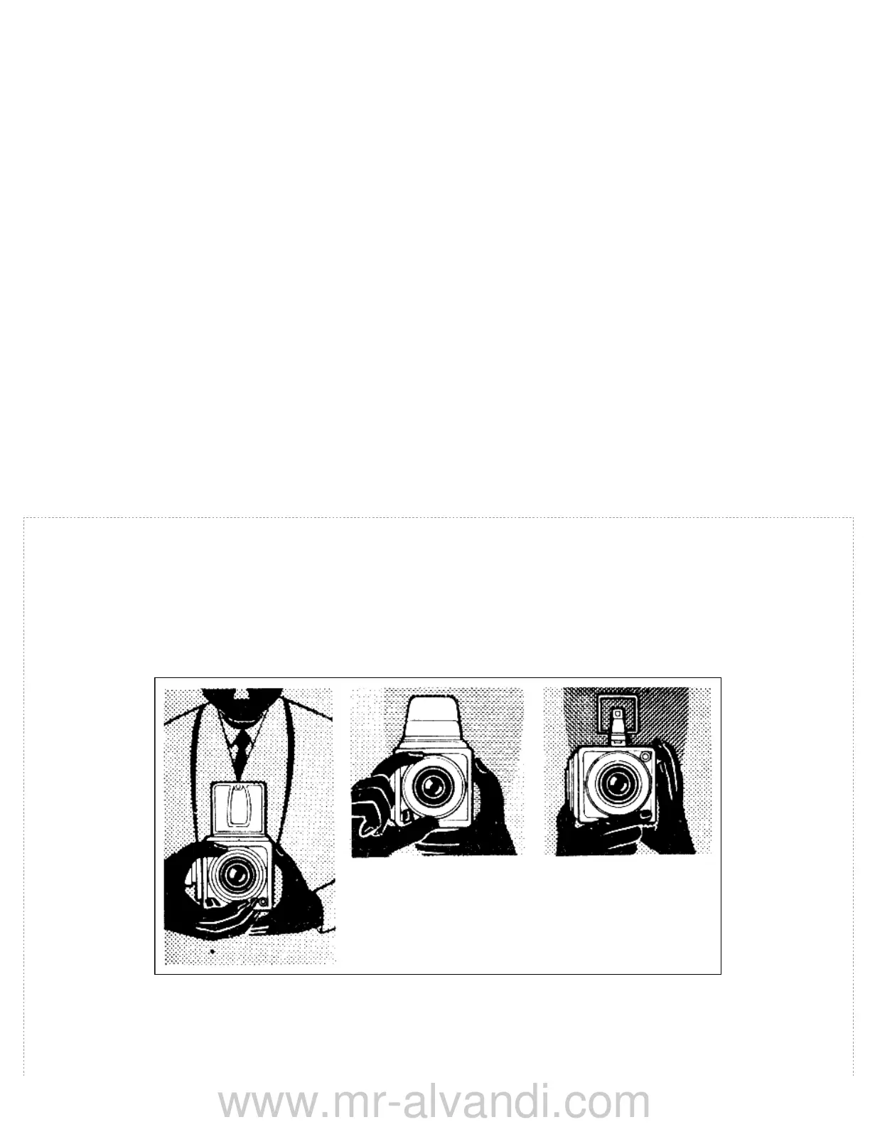 The normal hold consists in supporting the camera round the neck with the carrying strap, and steadying it with the left hand. The