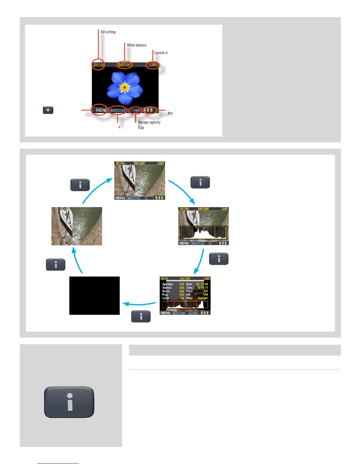 Shows a preview image overlaid with both a histogram and camera-setting details.