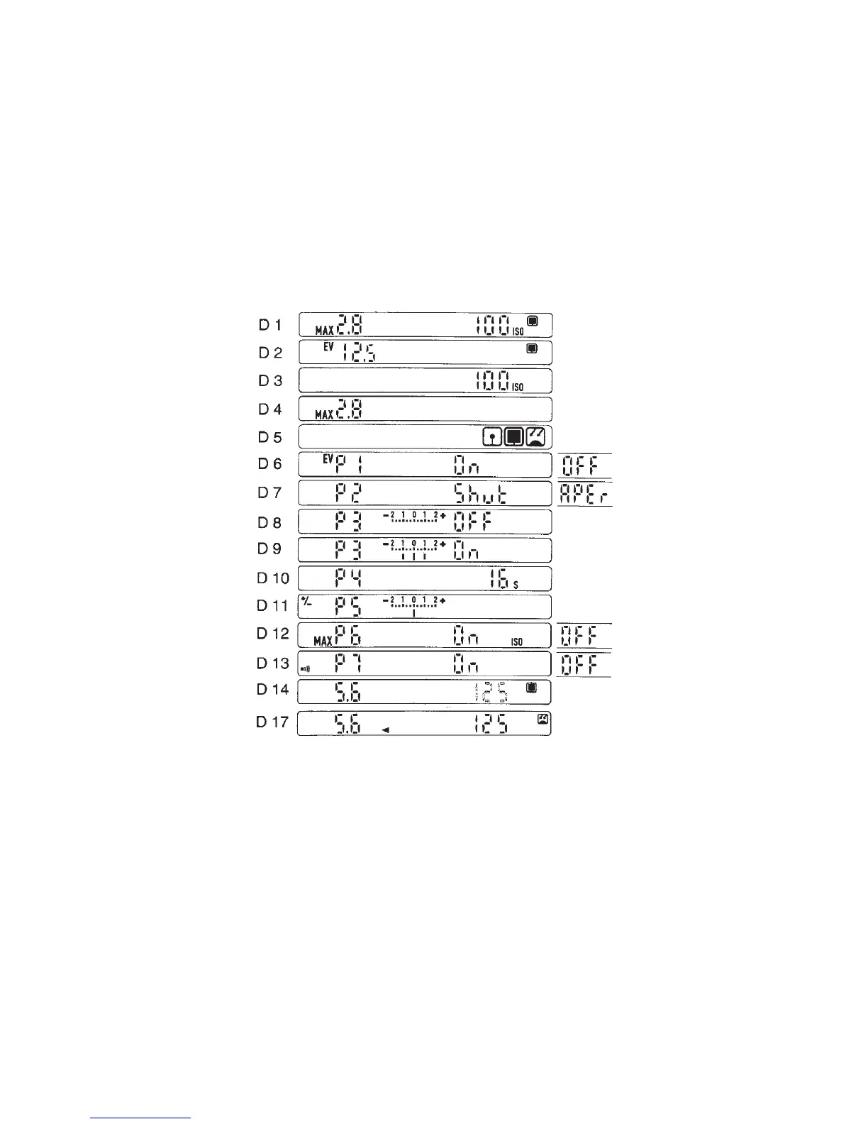 area metering and aperture priority (aperture fi gure solid) is shown (D 14). A stored value is