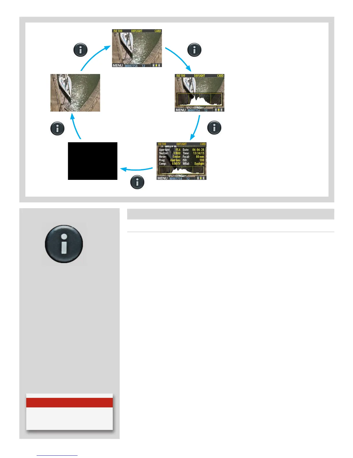 Shows a preview image overlaid with both a histogram and camera-setting details.