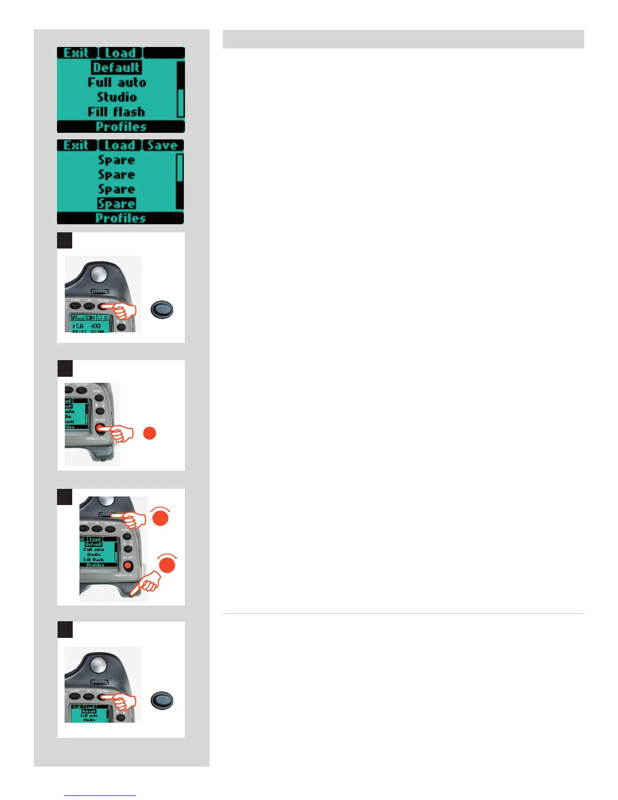 There are eight pro les: Default, Full auto, Studio, Fill fl ash. and four Spare reserved