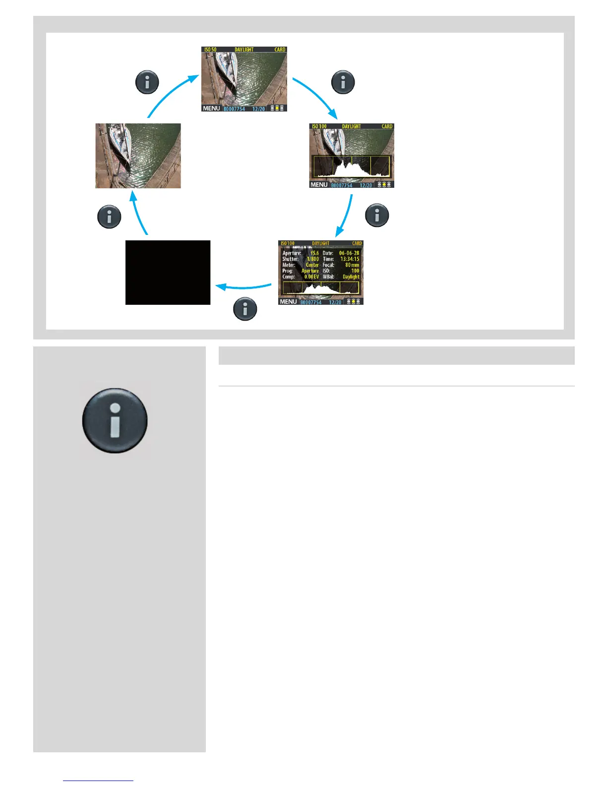 Shows a preview image overlaid with both a histogram and camera-setting details.