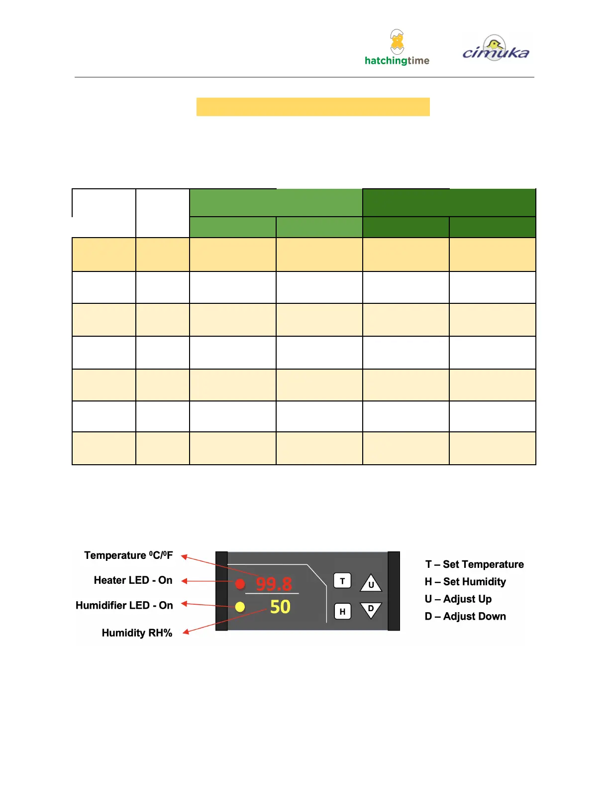 Hatching Time Cimuka CT Series - Incubation Parameter Configuration; Species-Specific Incubation Settings