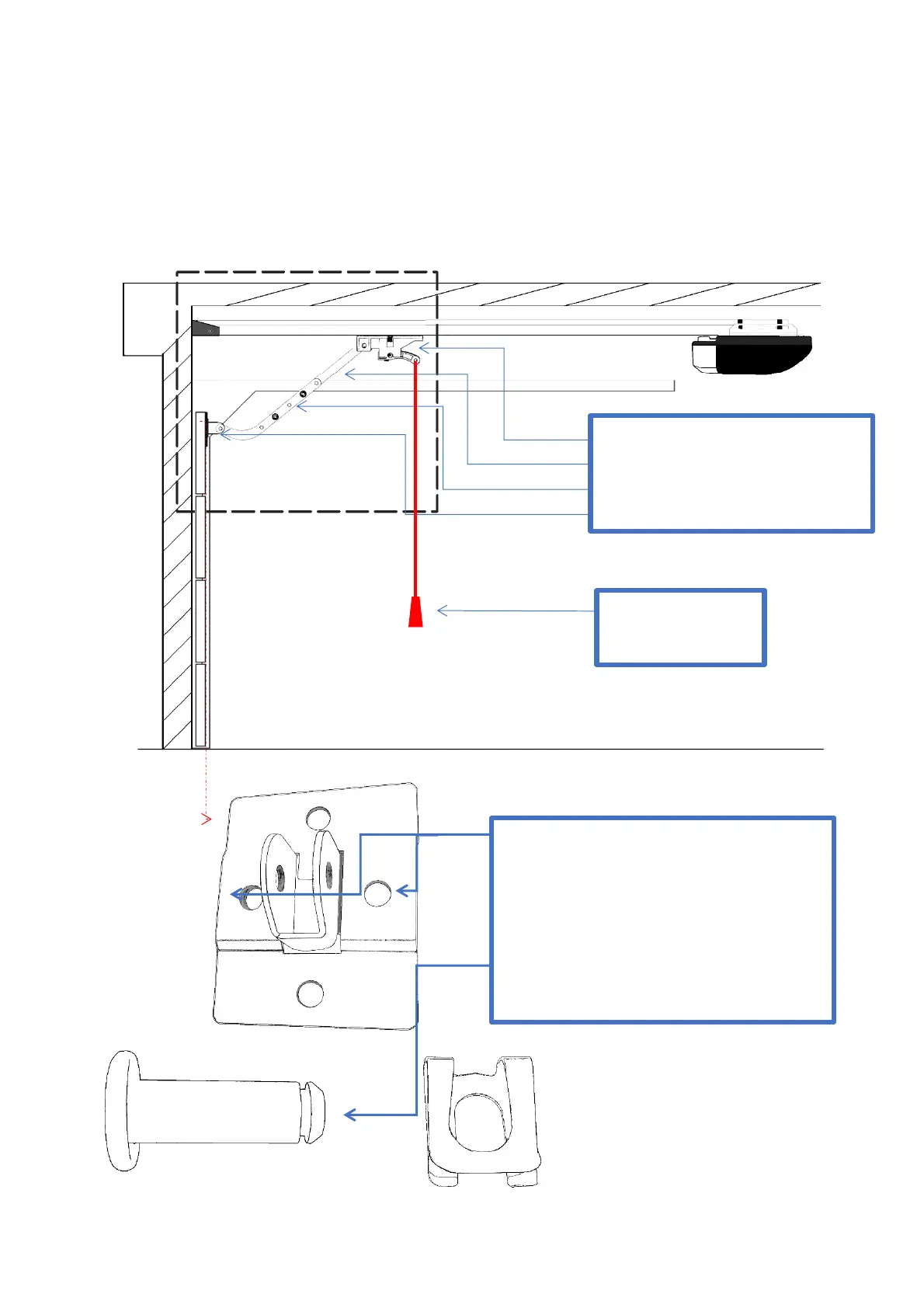 L arm to the door bracket with the pin and the split pin. Connect the straight arm to the shuttle with