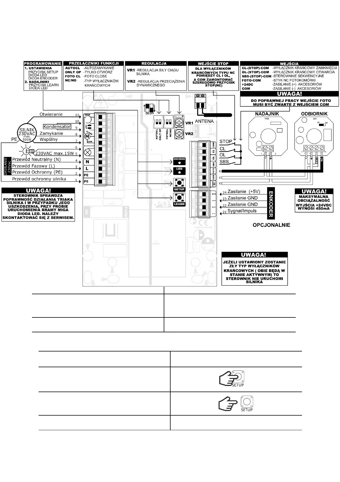 Programming the controller is done using the SETUP, LEARN buttons, LED and ENCODER