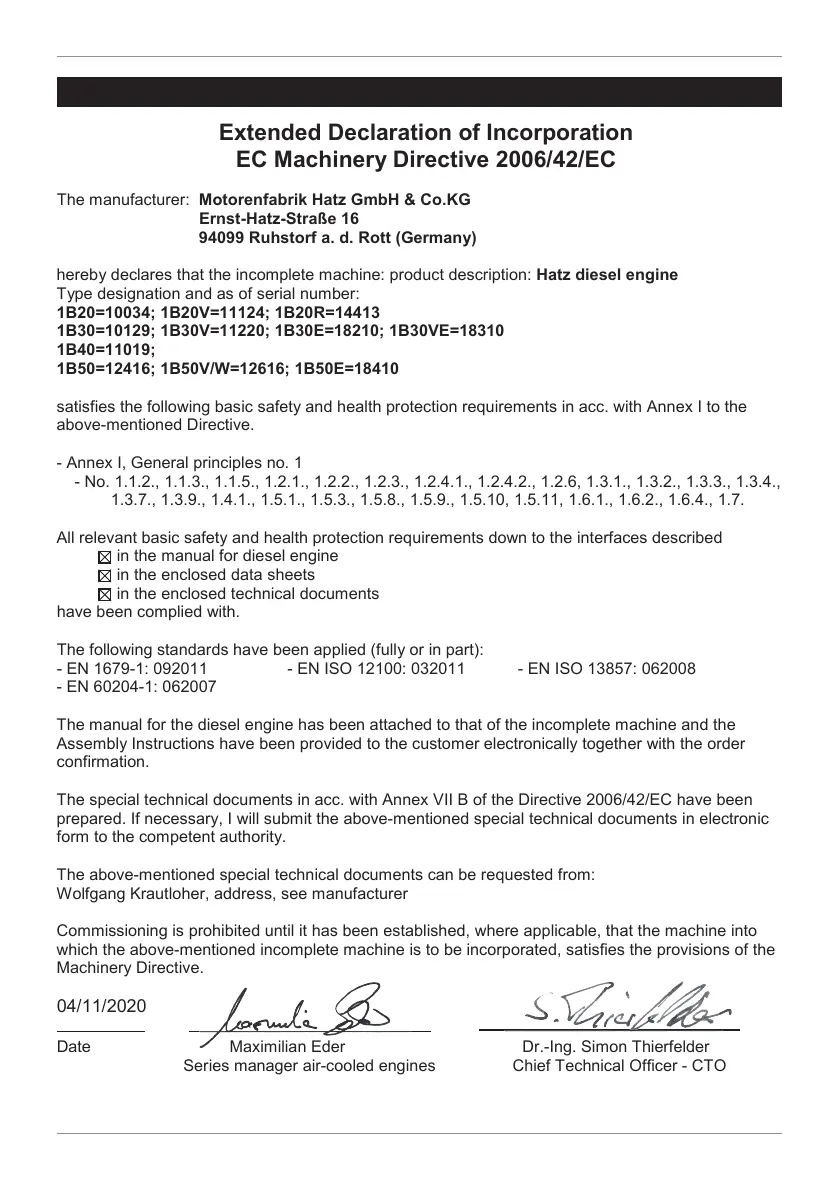 hereby declares that the incomplete machine: product description: Hatz diesel engine