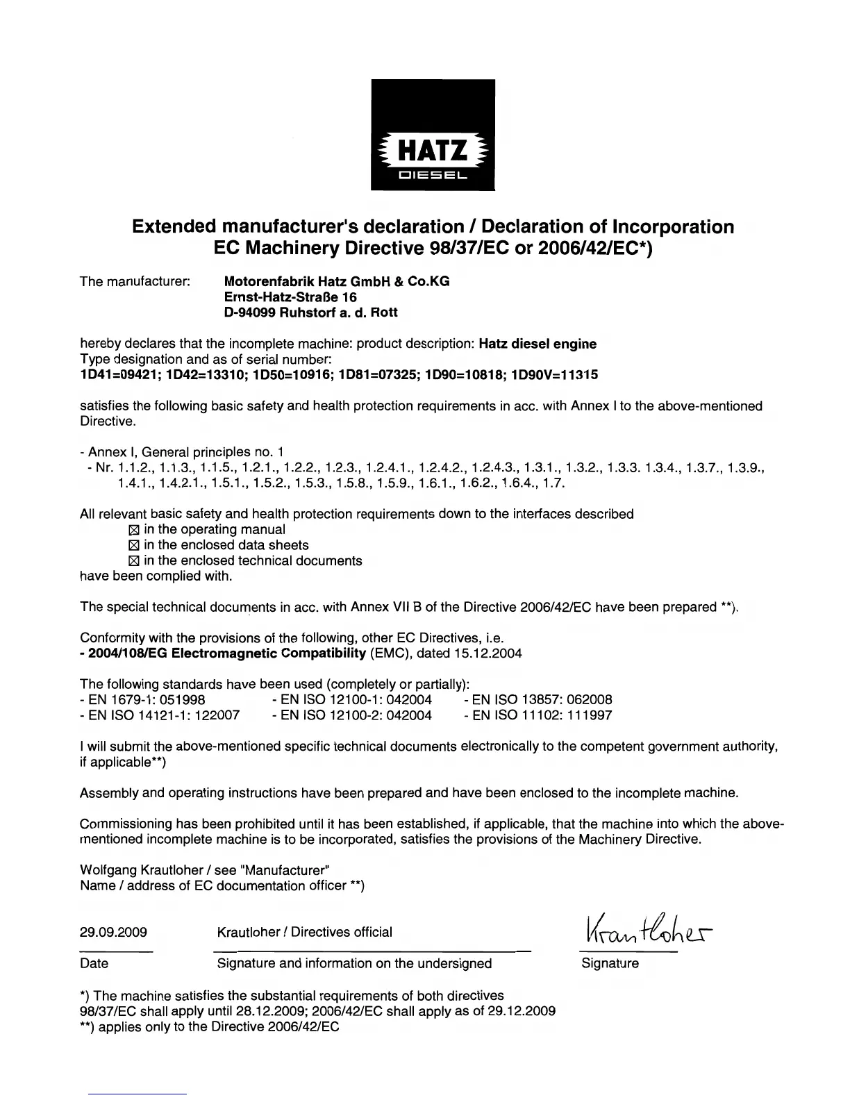Hatz 1D42 - Declaration for Incorporation
