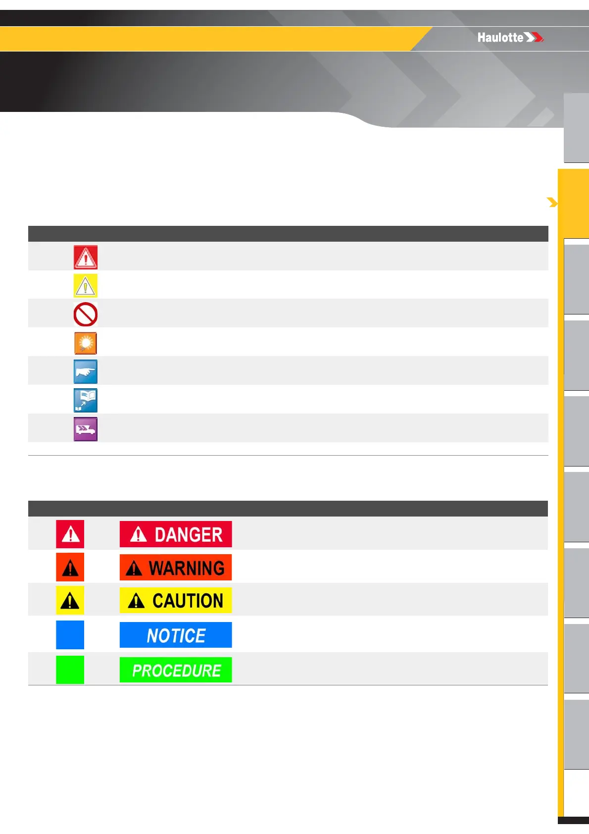Symbols and colors are used to alert the operator of safety precautions and/or to highlight