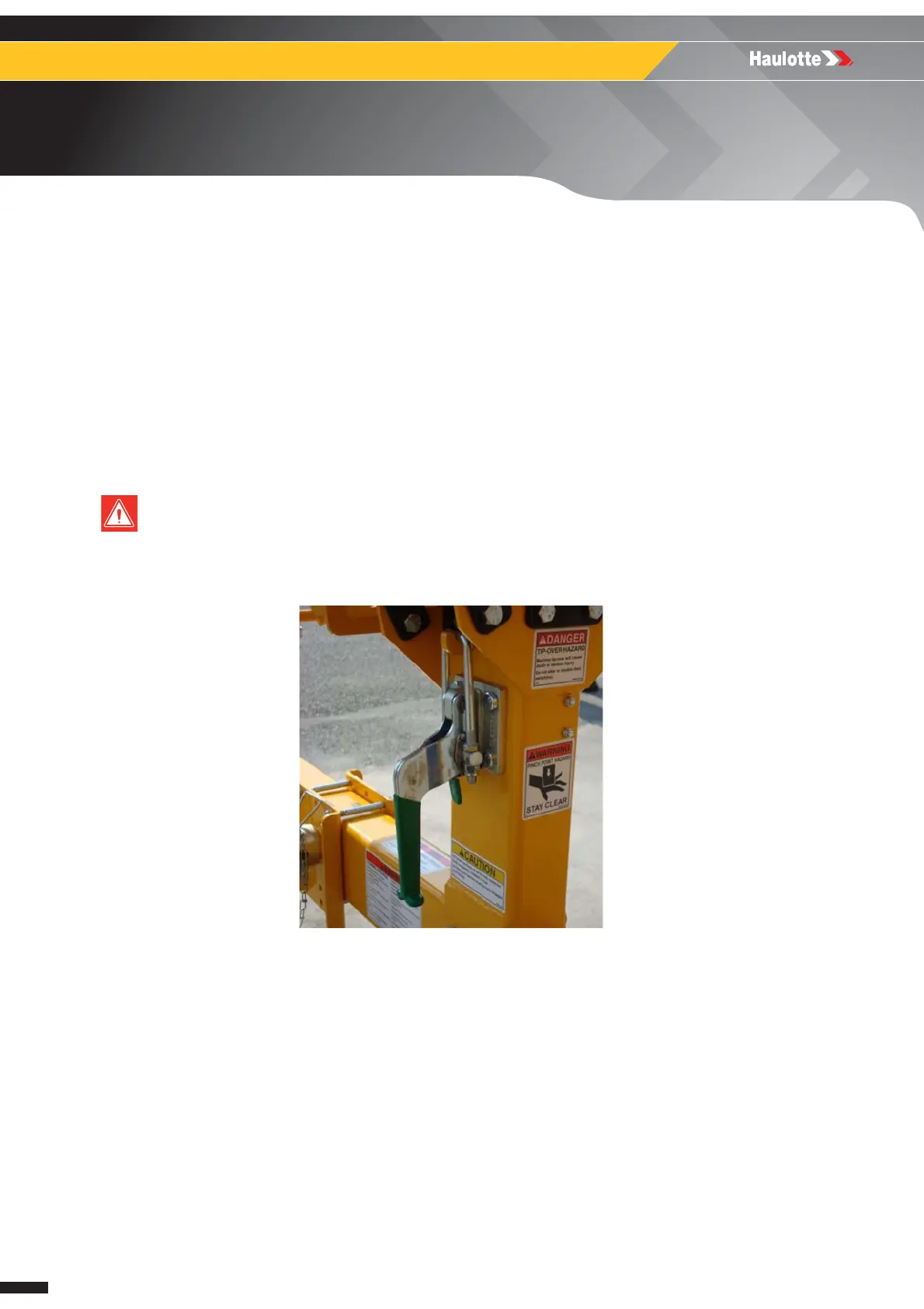 • Release the boom travel latch by raising the latch handle and swinging the clasp down.