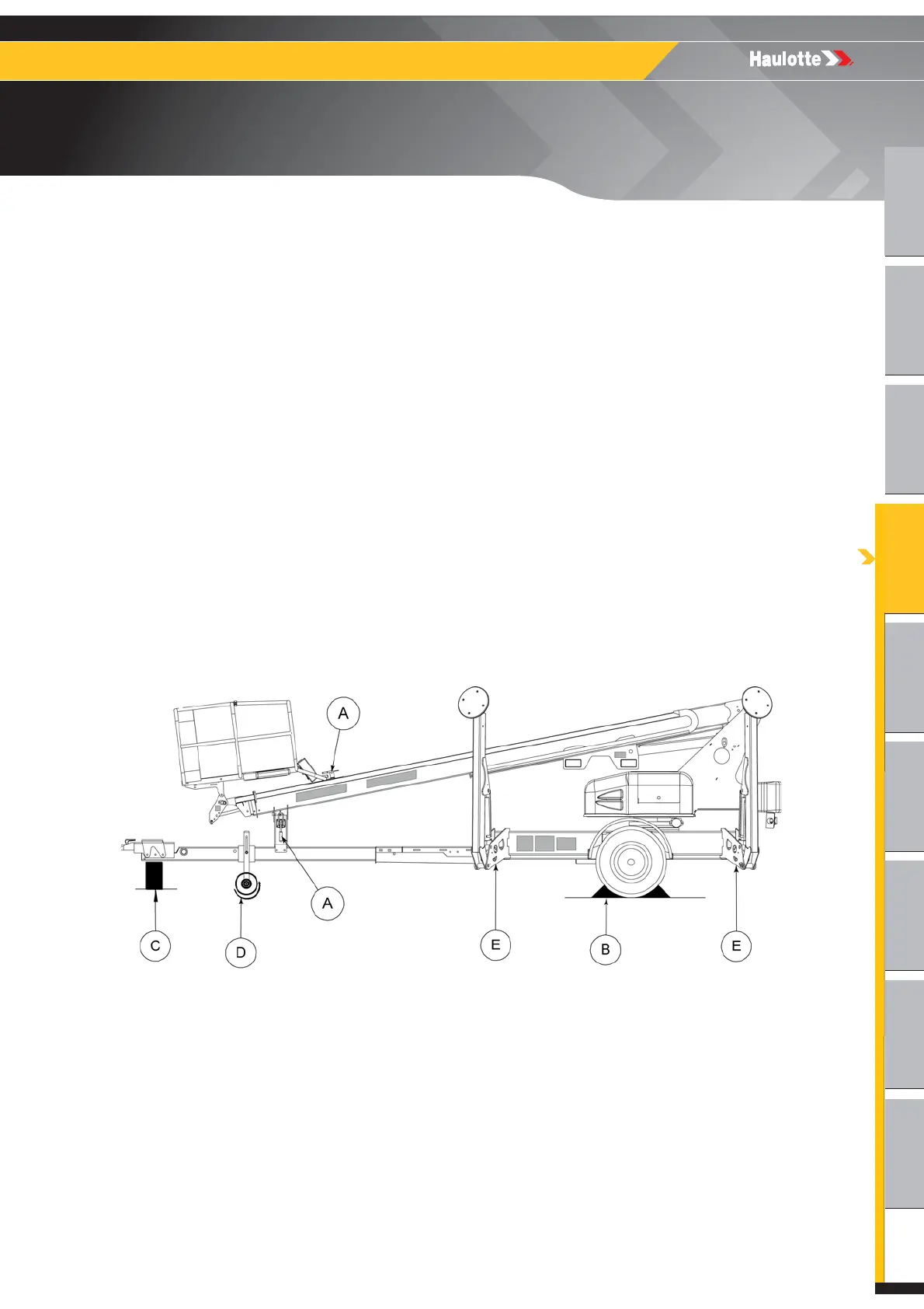 attachment points ( E ) beneath the machine, adjacent to the outriggers.