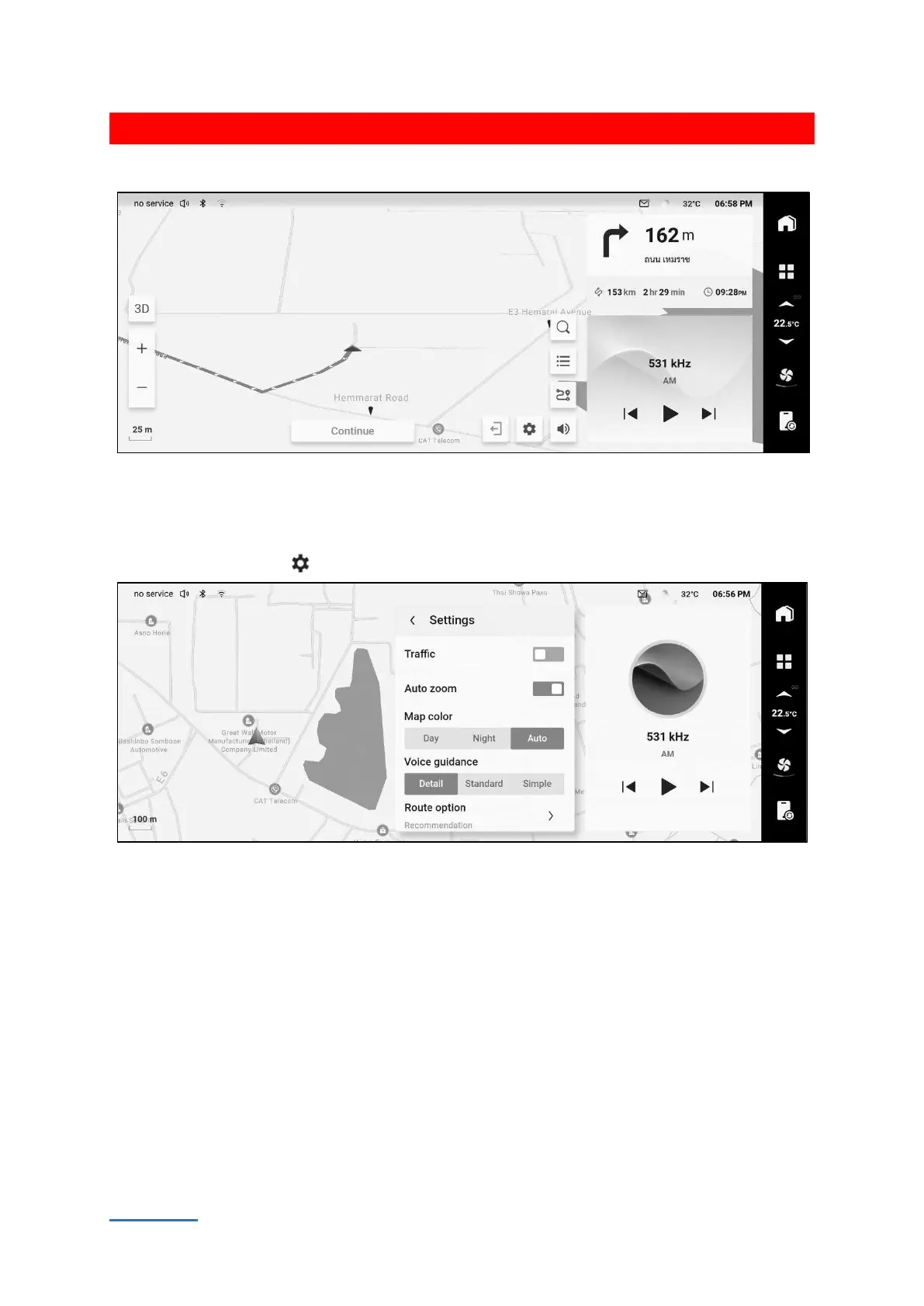 You can set current road condition, automatic scale, navigation broadcast, prefer path, home/ company
