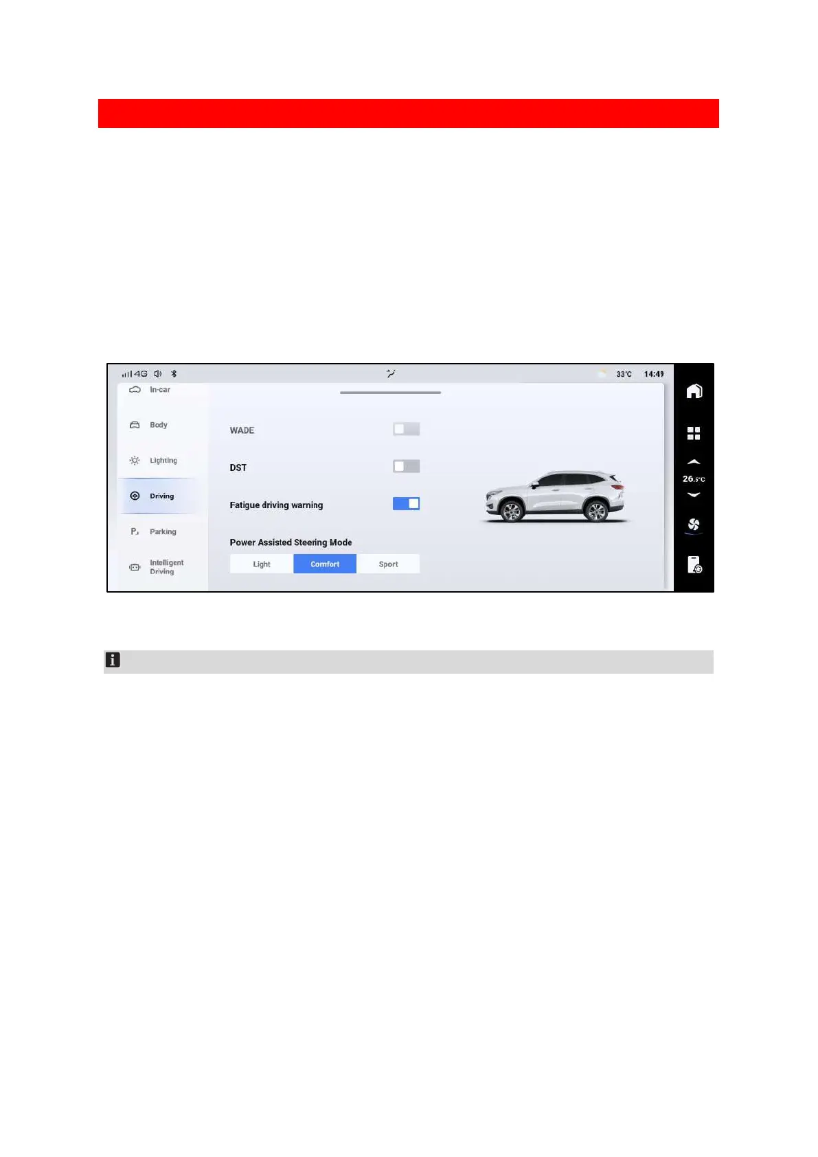 Before wading, open the wading mode via【Vehicle Setting】→【Driving】on the multimedia. After