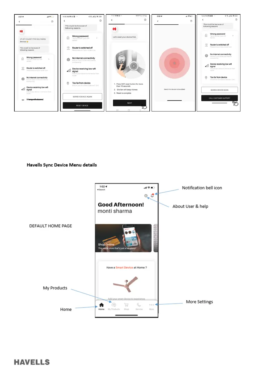 Havells Elio - App Interface and Error Handling; App Menu and Error Messages