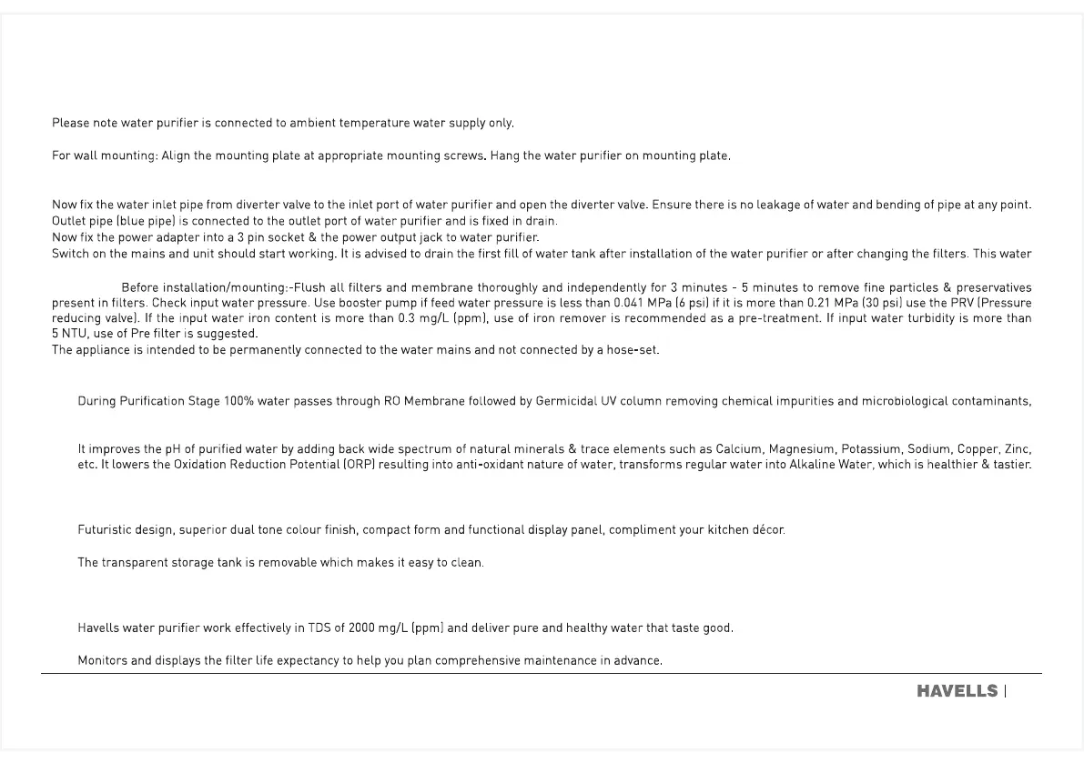 KEY FEATURES OF HAVELLS WATER PURIFIER