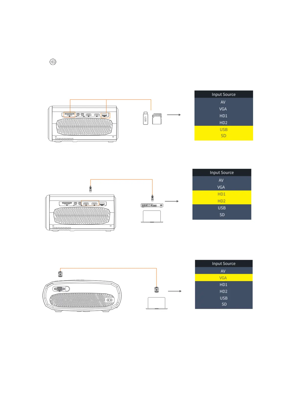 Havit PJ202 - INPUT SOURCE; Multimedia Connection; HD Connection; VGA Connection