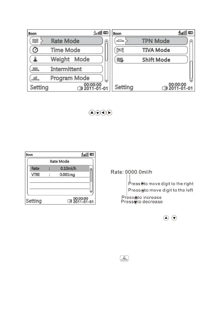 Select infusion mode by pressing key, press OK key to enter the parameter setting