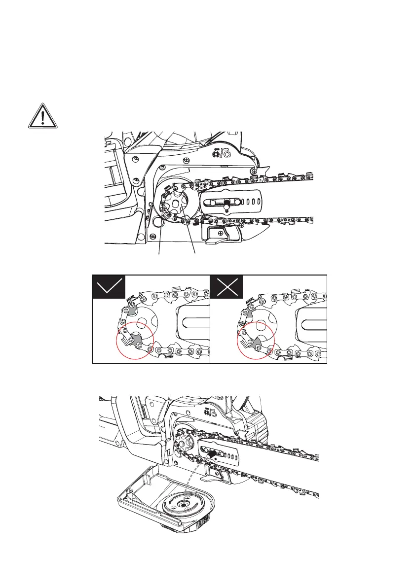 Warning! If chain drive links are not correctly seated into the sprocket teeth, the saw