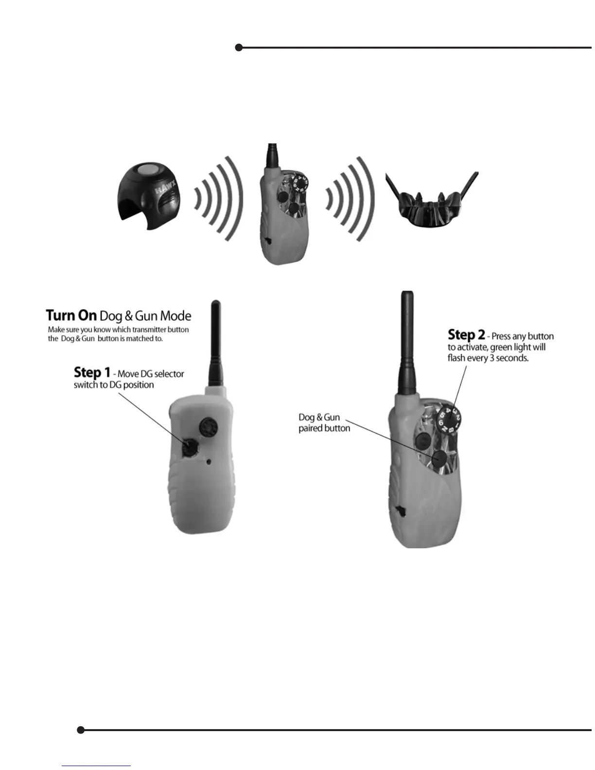 ter. The Dog & Gun switch allows easy transition between training mode and Dog & Gun mode. After pairing &