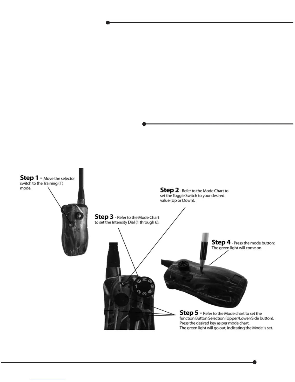 Note: Tone/Vibrate is available on all 2 dog modes by using the “B” on the intensity dial, or selecting Tone/Vibrate