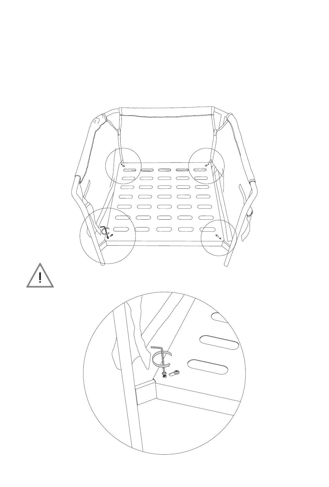 Gently secure the front legs (B) and back legs (C) to the frame (A) by fastening the screws (J)