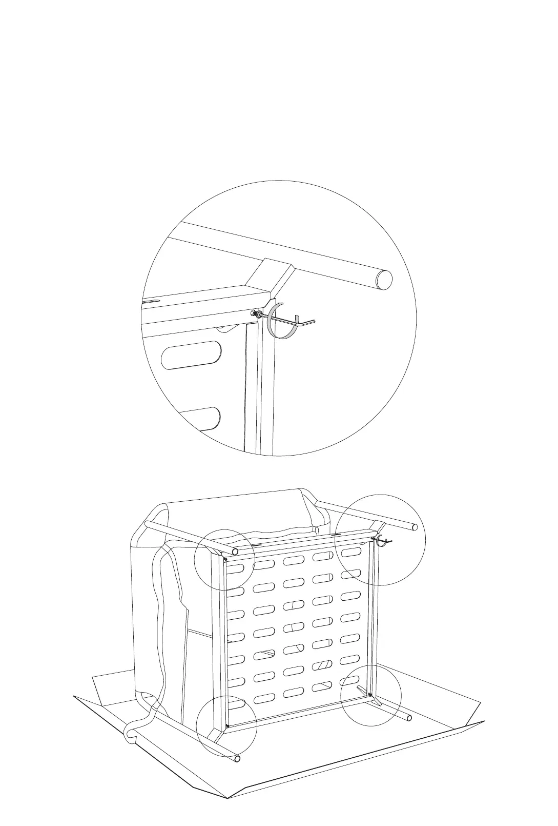Secure the front legs (B) and back legs (C) to the frame (A) from the bottom side