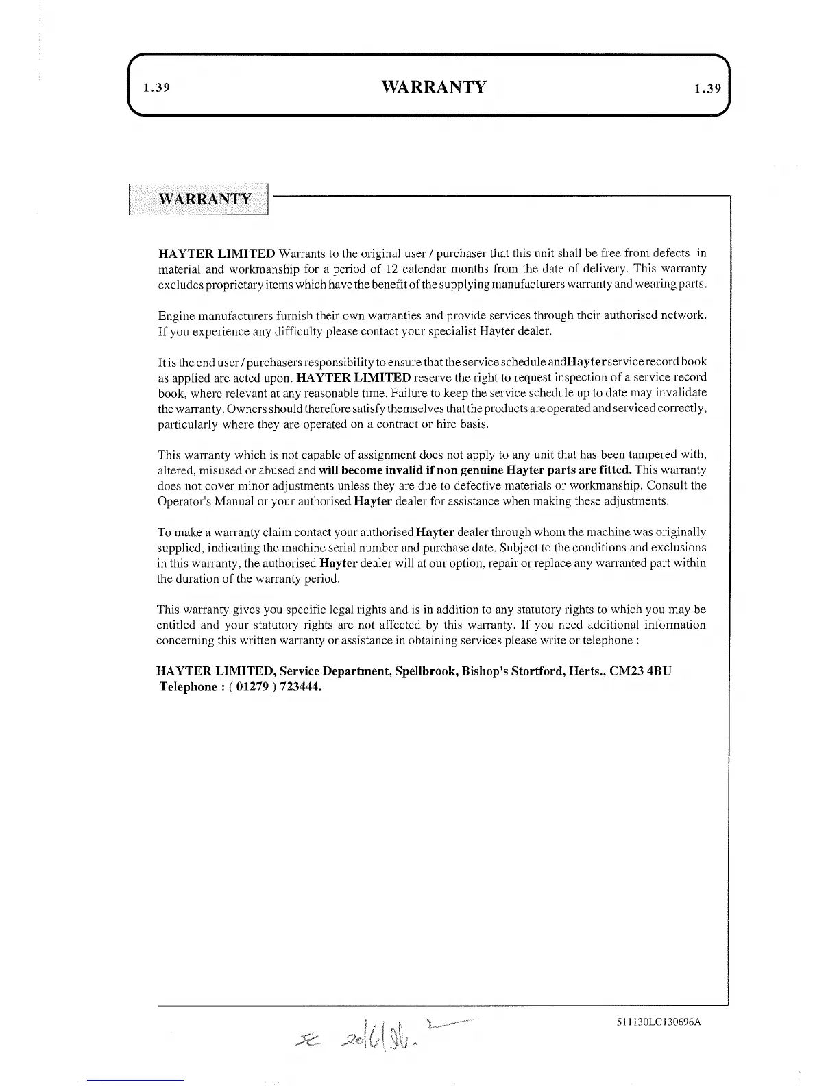 Hayter Condor 511N - Warranty Information