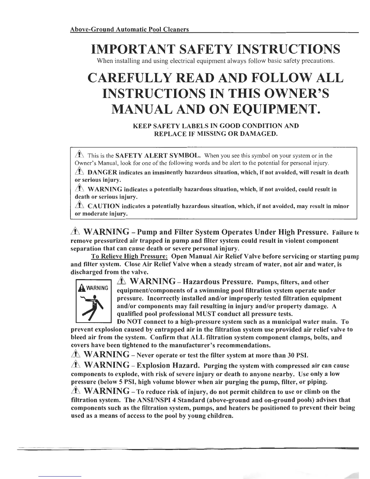 Hayward diver dave - Important Safety Instructions; High Pressure System Warnings; Explosion Hazard and Child Safety