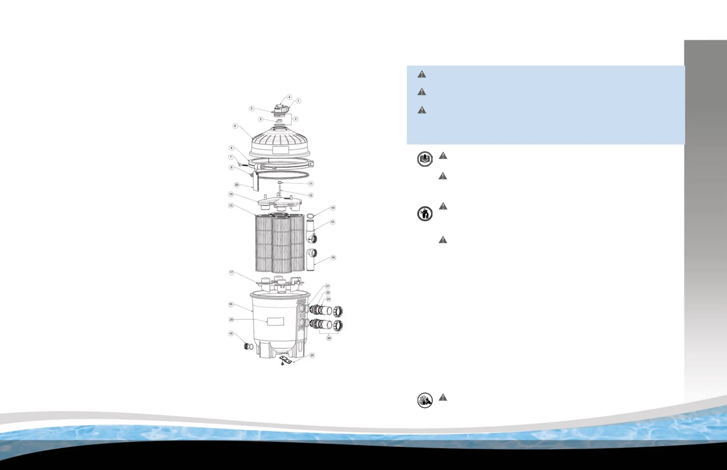 Pressure testing of the pump and lter system in excess of the 50 PSI can cause explosive separation of the