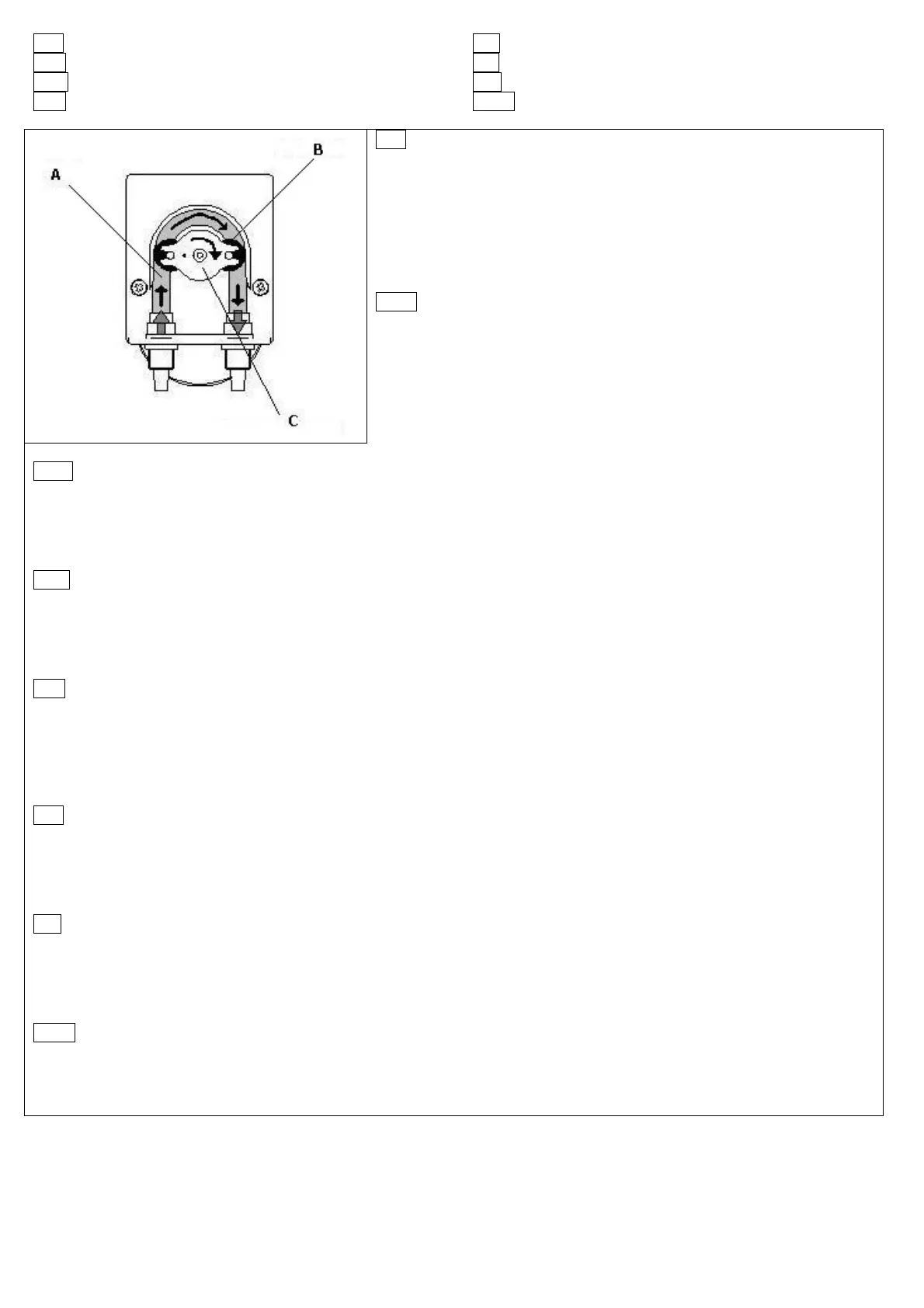 unos rodillos (B) y portarrodillo (C). La presión y liberación del tubo con la rotación de los rodillos, aspira el líquido y lo