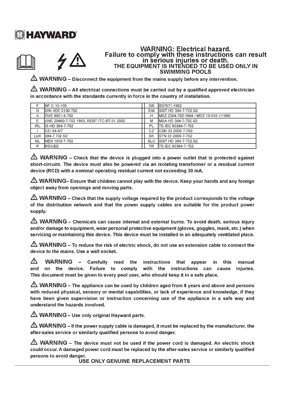Hayward POOL Rx Socket - Electrical Safety Precautions