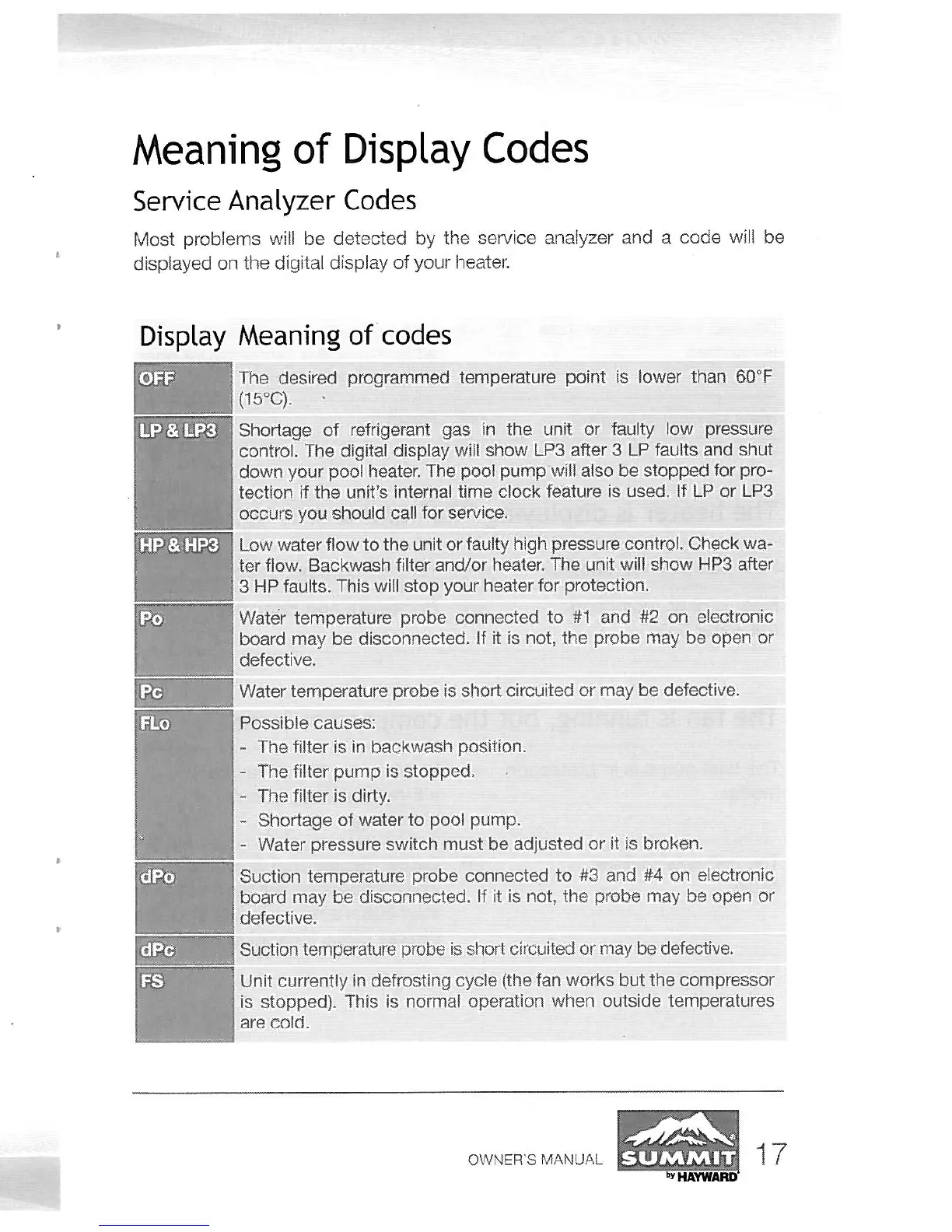Hayward summit SUM25TA - Troubleshooting; No Display, Compressor Running; Water Around Unit; Temperature Not Reached