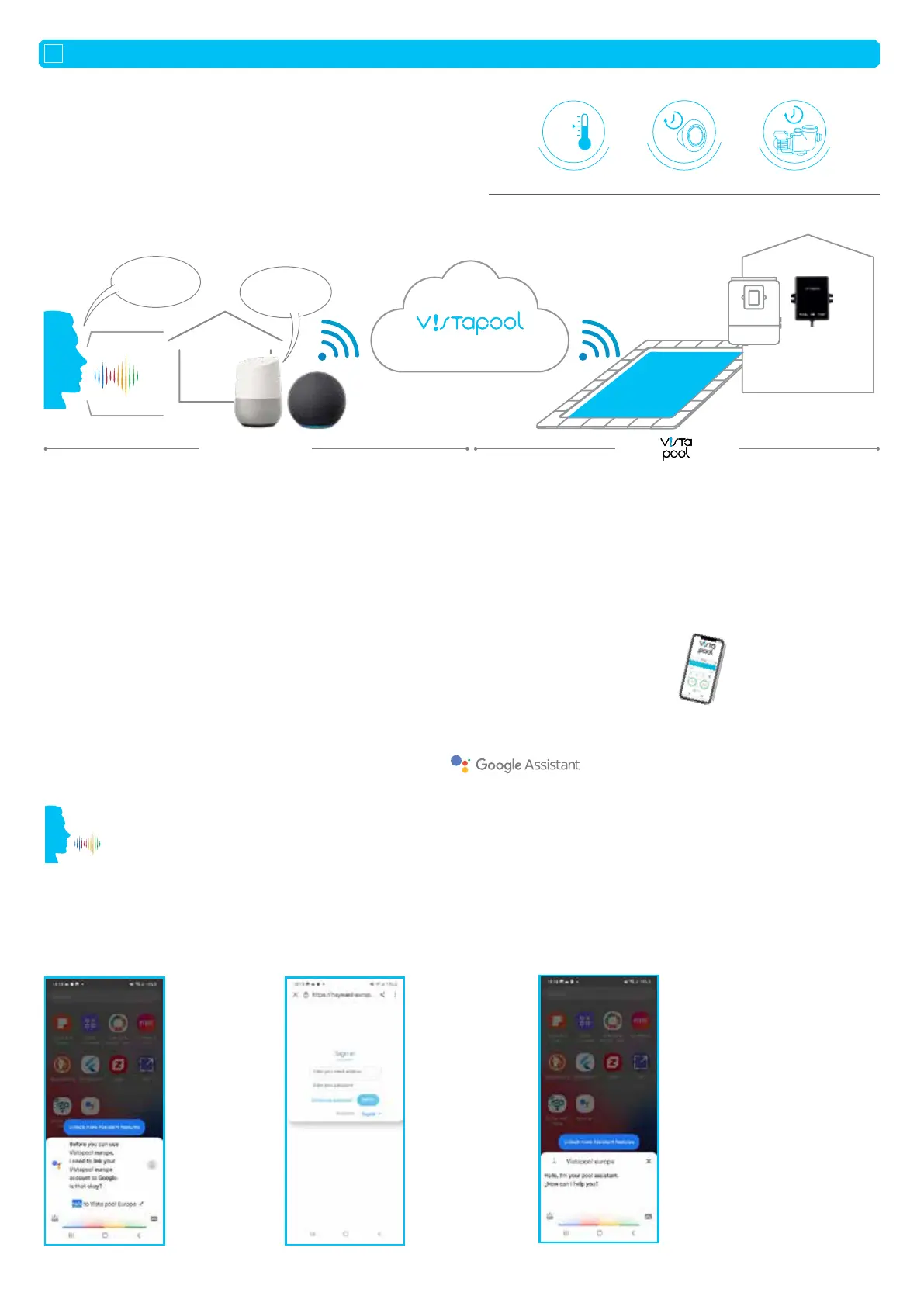 Start uw Applicatie: "Hey Google, talk to Vistapool Europe" en communiceer met uw zwembad.