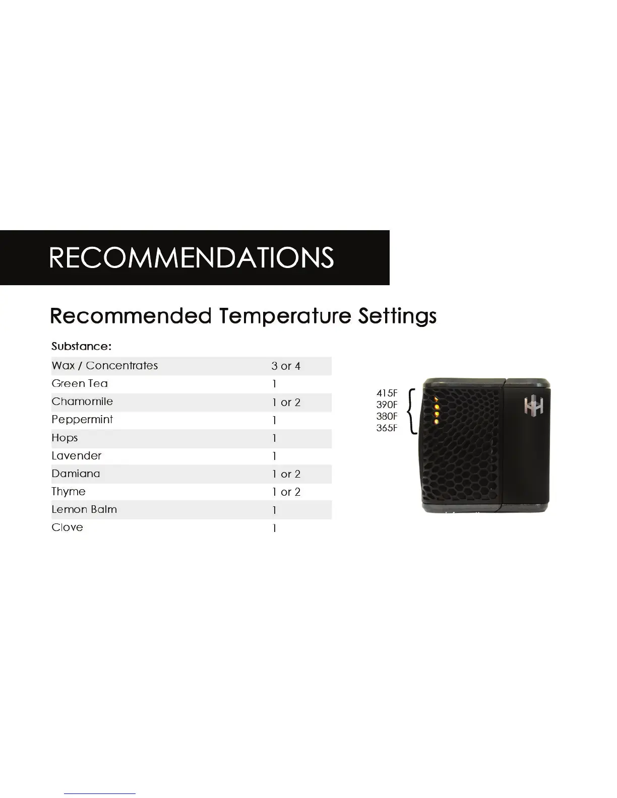 Haze Dual - RECOMMENDATIONS; Temperature Settings