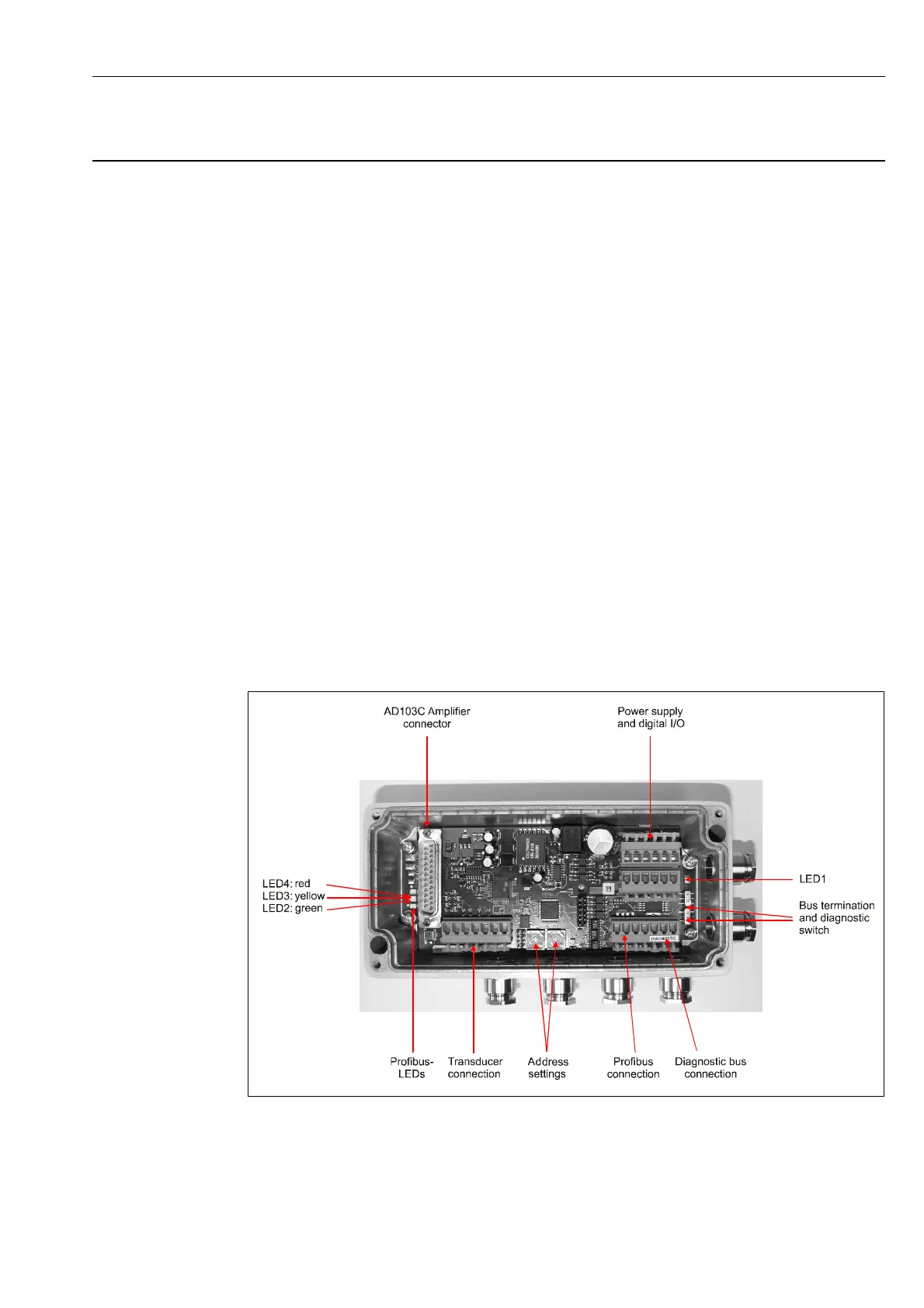 terminals for the transducer, power pack, digital inputs/outputs and Profibus connections,