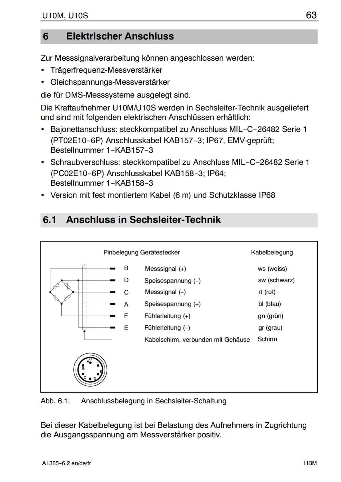 HBM U10M - 6 Elektrischer Anschluss; Anschluss in Sechsleiter-Technik