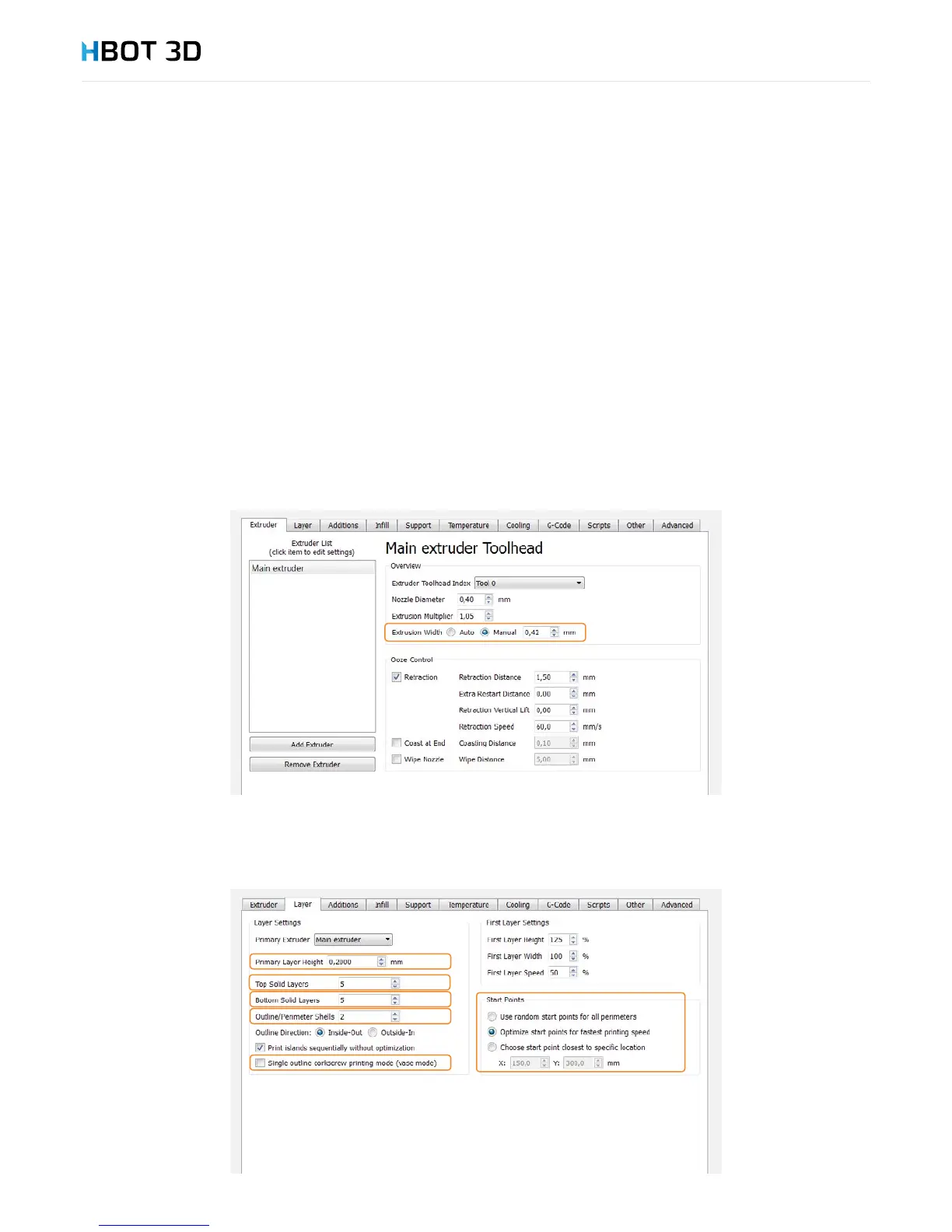 Extrusion Width – width of the paths laid down during extrusion. This value may be set between 100% up to 120% of nozzle diameter.