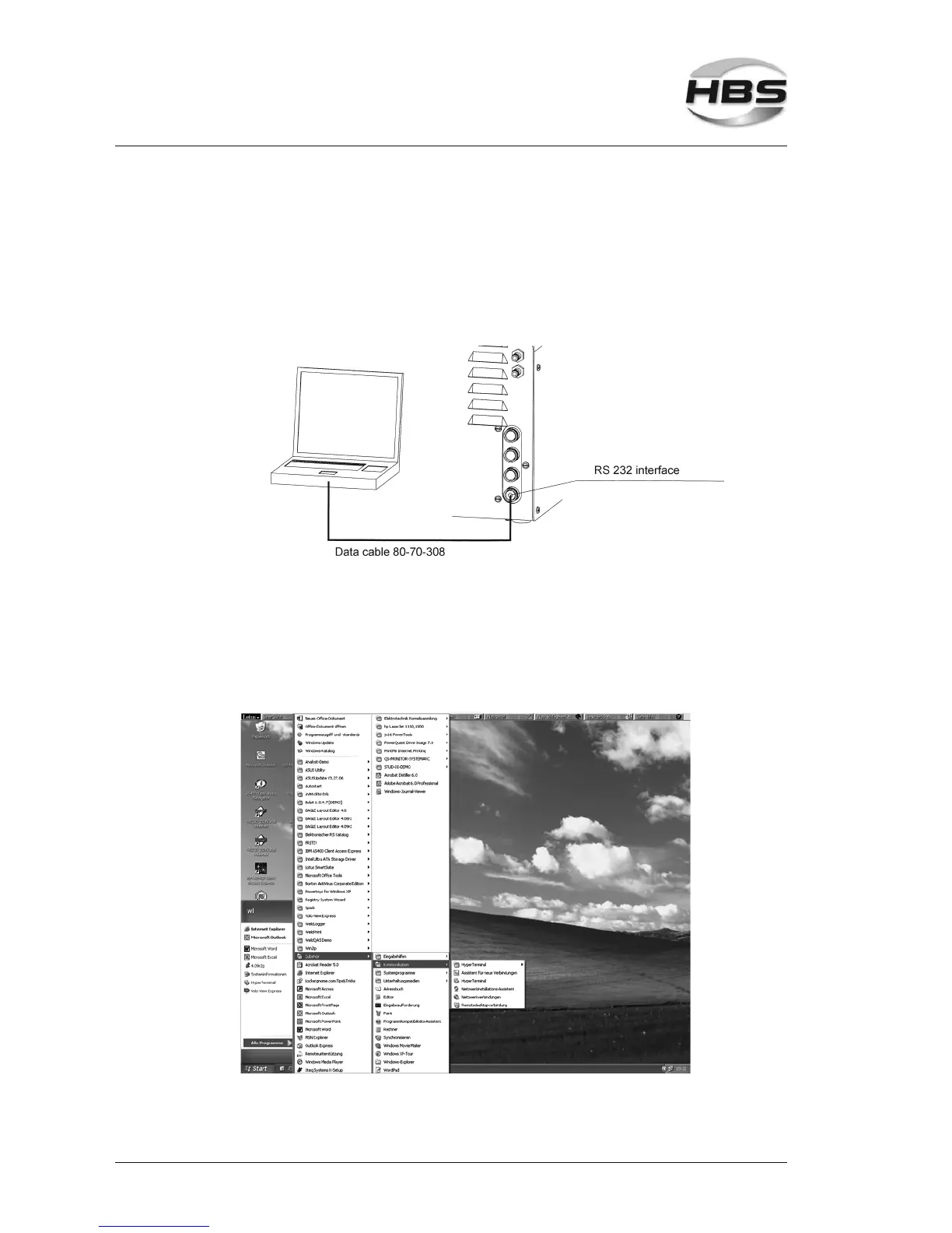 Link the data cable (HBS order no. 80-70-308) to the serial sleeve of the power