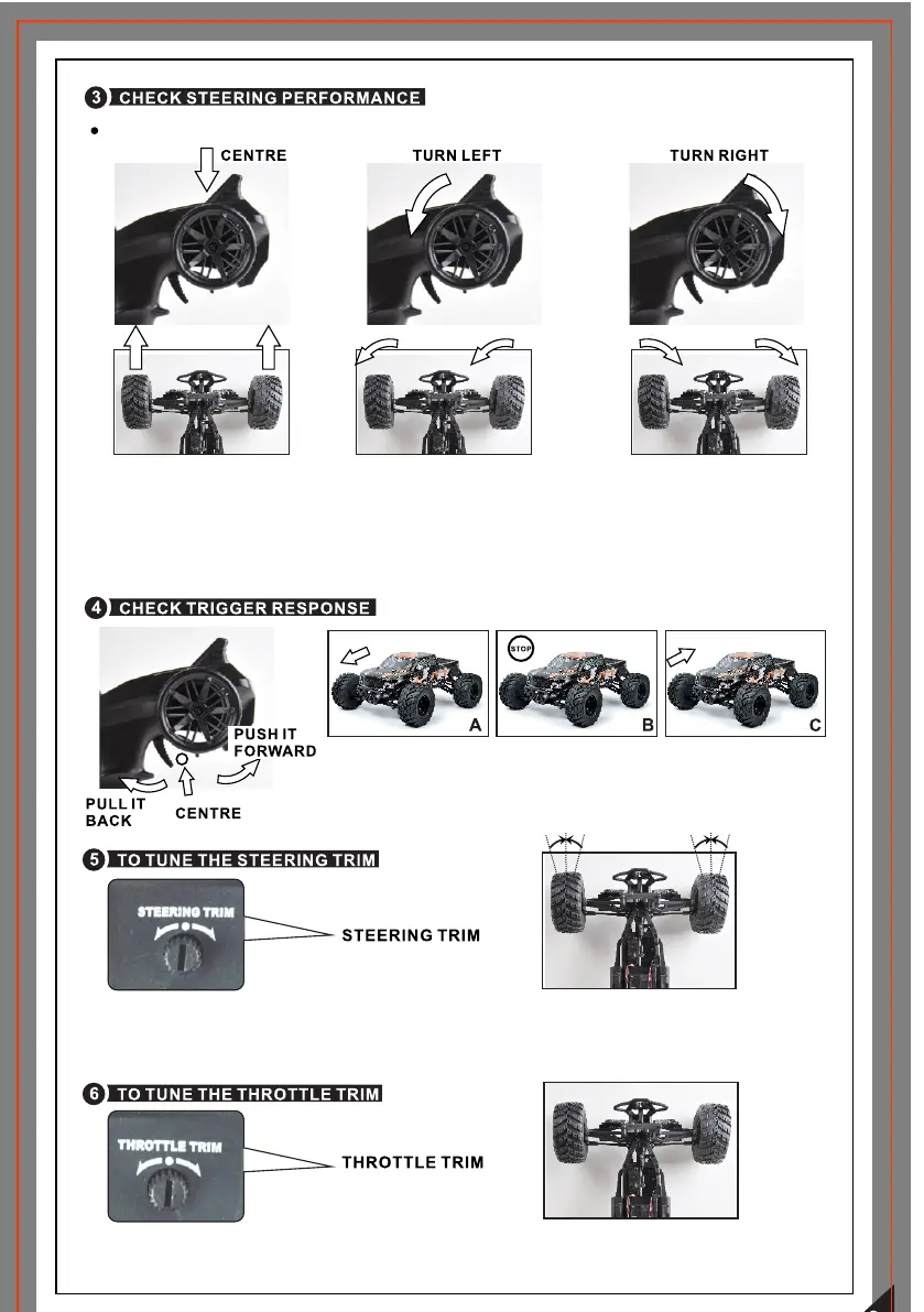 The trigger is unmoved and the vehicle is static. Tune the steering trim to enable the front wheels to be aligned.